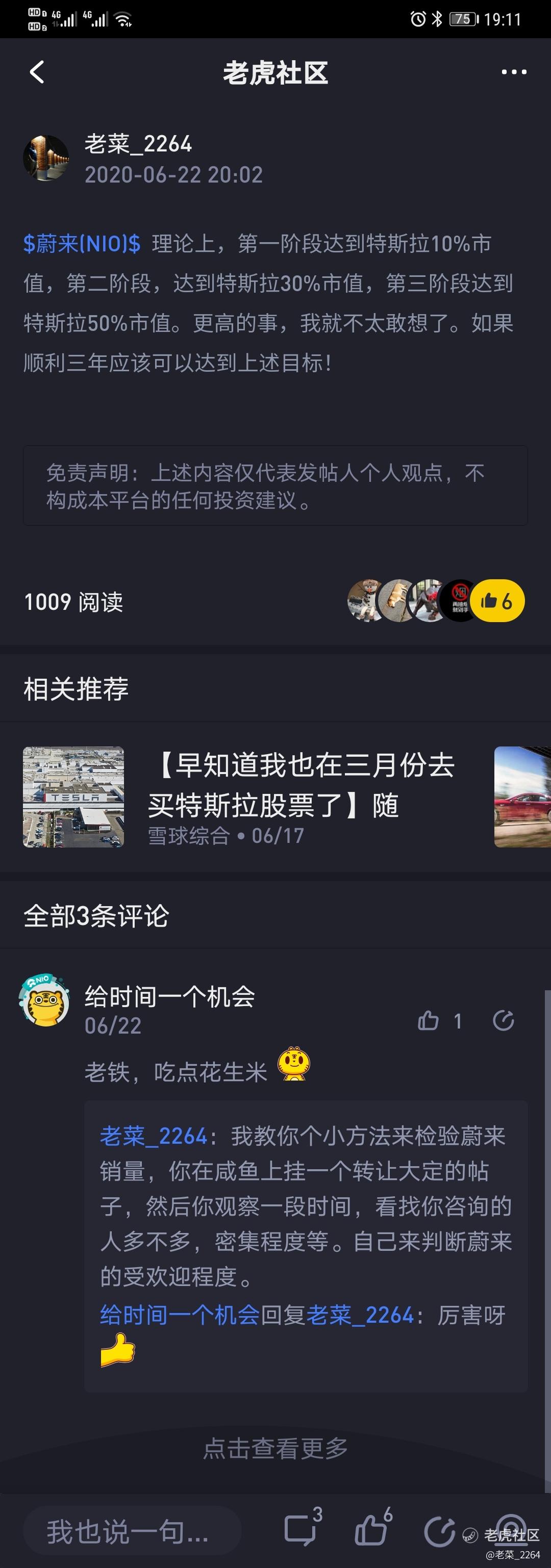 {"i18n":{"language":"zh_CN"},"detailType":1,"isChannel":false,"data":{"magic":2,"id":302188483,"tweetId":"302188483","gmtCreate":1604574735742,"gmtModify":1703833853886,"author":{"id":3540237254312329,"idStr":"3540237254312329","authorId":3540237254312329,"authorIdStr":"3540237254312329","name":"老菜_2264","avatar":"https://static.tigerbbs.com/77faa534373af1867265537c31086bf3","vip":1,"userType":1,"introduction":"","boolIsFan":false,"boolIsHead":false,"crmLevel":2,"crmLevelSwitch":0,"individualDisplayBadges":[],"fanSize":11,"starInvestorFlag":false},"themes":[],"images":[{"img":"https://static.tigerbbs.com/bd567ce511a21f68f1ac359e924504cb","width":"1080","height":"3075"}],"coverImages":[{"img":"https://static.tigerbbs.com/bd567ce511a21f68f1ac359e924504cb","width":"1080","height":"3075"}],"extraTitle":"","html":"<html><head></head><body><p><a href=\"https://laohu8.com/S/NIO\">$蔚来(NIO)$</a>六月时候,我在没有花生米的情况下做了大胆预测!</p><p><img src=\"https://static.tigerbbs.com/bd567ce511a21f68f1ac359e924504cb\" tg-width=\"1080\" tg-height=\"3075\"></p></body></html>","htmlText":"<html><head></head><body><p><a href=\"https://laohu8.com/S/NIO\">$蔚来(NIO)$</a>六月时候,我在没有花生米的情况下做了大胆预测!</p><p><img src=\"https://static.tigerbbs.com/bd567ce511a21f68f1ac359e924504cb\" tg-width=\"1080\" tg-height=\"3075\"></p></body></html>","text":"$蔚来(NIO)$六月时候,我在没有花生米的情况下做了大胆预测!","highlighted":1,"essential":1,"paper":1,"likeSize":9,"commentSize":7,"repostSize":0,"favoriteSize":0,"link":"https://laohu8.com/post/302188483","repostId":0,"isVote":1,"tweetType":1,"viewCount":6191,"commentLimit":10,"likeStatus":false,"favoriteStatus":false,"reportStatus":false,"symbols":["NIO"],"verified":2,"subType":0,"readableState":1,"langContent":"CN","currentLanguage":"CN","warmUpFlag":false,"orderFlag":false,"shareable":true,"causeOfNotShareable":"","featuresForAnalytics":[],"commentAndTweetFlag":false,"andRepostAutoSelectedFlag":false,"upFlag":false,"length":55,"xxTargetLangEnum":"ZH_CN"},"commentList":[{"id":3005027,"commentId":"3005027","gmtCreate":1604574883754,"gmtModify":1604574883754,"authorId":3529967457468061,"author":{"id":3529967457468061,"idStr":"3529967457468061","authorId":3529967457468061,"name":"我能巴菲特","avatar":"https://static.tigerbbs.com/0ec7278d85cc0b9c0d27e298652d046f","vip":1,"crmLevel":2,"crmLevelSwitch":0,"individualDisplayBadges":[]},"repliedAuthorId":0,"objectId":302188483,"objectIdStr":"302188483","type":1,"supId":0,"supIdStr":"0","prevId":0,"prevIdStr":"0","content":"这里面那个方法不管用,有钱买蔚来的人不上闲鱼","text":"这里面那个方法不管用,有钱买蔚来的人不上闲鱼","html":"这里面那个方法不管用,有钱买蔚来的人不上闲鱼","likeSize":0,"commentSize":1,"subComments":[{"id":3005032,"commentId":"3005032","gmtCreate":1604574926736,"gmtModify":1604574926736,"authorId":3540237254312329,"author":{"id":3540237254312329,"idStr":"3540237254312329","authorId":3540237254312329,"name":"老菜_2264","avatar":"https://static.tigerbbs.com/77faa534373af1867265537c31086bf3","vip":1,"crmLevel":2,"crmLevelSwitch":0,"individualDisplayBadges":[]},"repliedAuthorId":0,"objectId":302188483,"objectIdStr":"302188483","type":1,"supId":3005027,"supIdStr":"3005027","prevId":0,"prevIdStr":"0","content":"看主贴内容!","text":"看主贴内容!","html":"看主贴内容!","disclaimerType":0}],"verified":10,"allocateAmount":0,"commentType":"valid","coins":0,"score":0,"disclaimerType":0},{"id":3005069,"commentId":"3005069","gmtCreate":1604575578809,"gmtModify":1604575578809,"authorId":3540237254312329,"author":{"id":3540237254312329,"idStr":"3540237254312329","authorId":3540237254312329,"name":"老菜_2264","avatar":"https://static.tigerbbs.com/77faa534373af1867265537c31086bf3","vip":1,"crmLevel":2,"crmLevelSwitch":0,"individualDisplayBadges":[]},"repliedAuthorId":0,"objectId":302188483,"objectIdStr":"302188483","type":1,"supId":0,"supIdStr":"0","prevId":0,"prevIdStr":"0","content":"10%=400亿市值,30%=1200亿市值,50%=2000亿市值,大伙自己算算吧!","text":"10%=400亿市值,30%=1200亿市值,50%=2000亿市值,大伙自己算算吧!","html":"10%=400亿市值,30%=1200亿市值,50%=2000亿市值,大伙自己算算吧!","likeSize":2,"commentSize":0,"subComments":[],"verified":10,"allocateAmount":0,"commentType":"valid","coins":0,"score":0,"disclaimerType":0},{"id":3005130,"commentId":"3005130","gmtCreate":1604577124747,"gmtModify":1604577124747,"authorId":3564642155964111,"author":{"id":3564642155964111,"idStr":"3564642155964111","authorId":3564642155964111,"name":"牧渊","avatar":"https://static.tigerbbs.com/b9bd84b99574b8a9dd04fe4d27669626","vip":1,"crmLevel":2,"crmLevelSwitch":0,"individualDisplayBadges":[]},"repliedAuthorId":0,"objectId":302188483,"objectIdStr":"302188483","type":1,"supId":0,"supIdStr":"0","prevId":0,"prevIdStr":"0","content":"我也是这么估计的,达到三分之一个特斯拉没有问题。当然是不出现全属性金融危机的情况下。今年三月出现了一次股灾,全球性金融危机出现的概率小了很多","text":"我也是这么估计的,达到三分之一个特斯拉没有问题。当然是不出现全属性金融危机的情况下。今年三月出现了一次股灾,全球性金融危机出现的概率小了很多","html":"我也是这么估计的,达到三分之一个特斯拉没有问题。当然是不出现全属性金融危机的情况下。今年三月出现了一次股灾,全球性金融危机出现的概率小了很多","likeSize":0,"commentSize":0,"subComments":[],"verified":10,"allocateAmount":0,"commentType":"valid","coins":0,"score":0,"disclaimerType":0},{"id":3005141,"commentId":"3005141","gmtCreate":1604577348498,"gmtModify":1604577348498,"authorId":3565855597893486,"author":{"id":3565855597893486,"idStr":"3565855597893486","authorId":3565855597893486,"name":"东莞猛虎","avatar":"https: