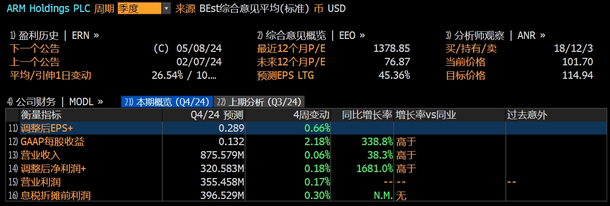 根据彭博分析师预期,ARM2024财年第四财季营收为8.76亿美元,调整后净利润为3.2亿美元,调整后EPS为0.289美元。