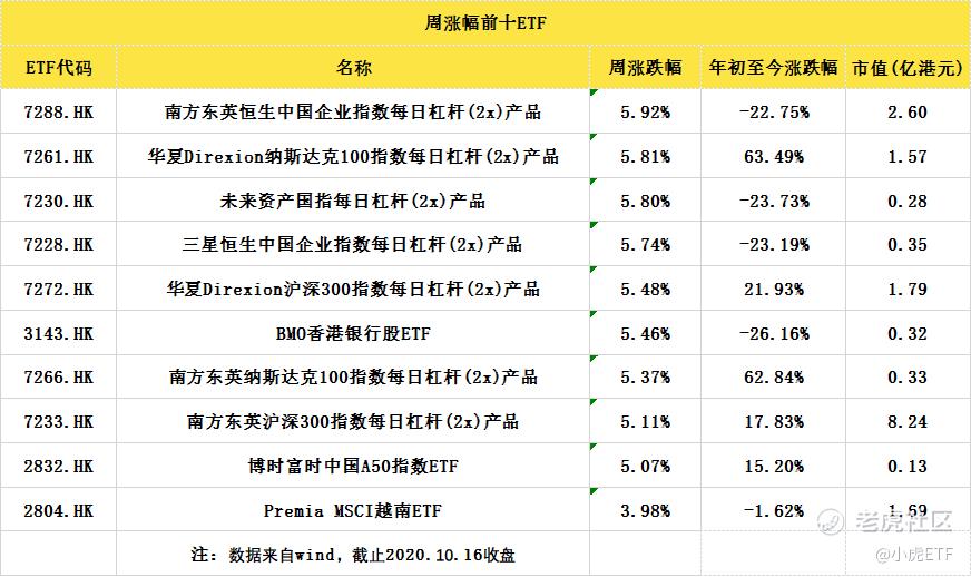 香港上市ETF方面,南方东英恒生中国企业指数每日杠杆(2x)产品(7288.HK)周上涨5.92%,涨幅最大。