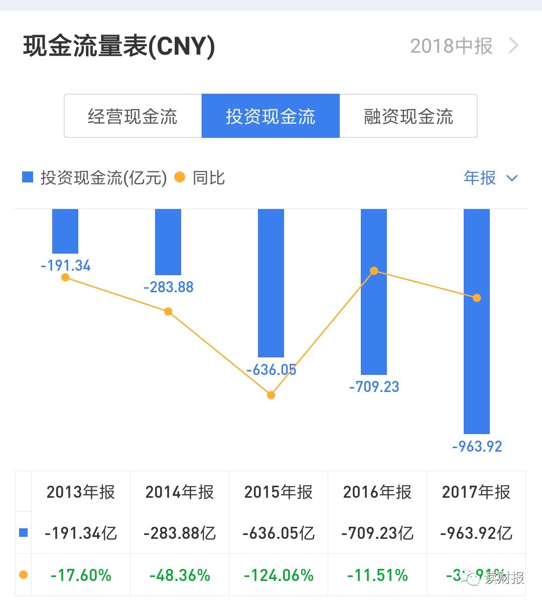 投资活动现金流(负值表示净流出,数据截取自**)