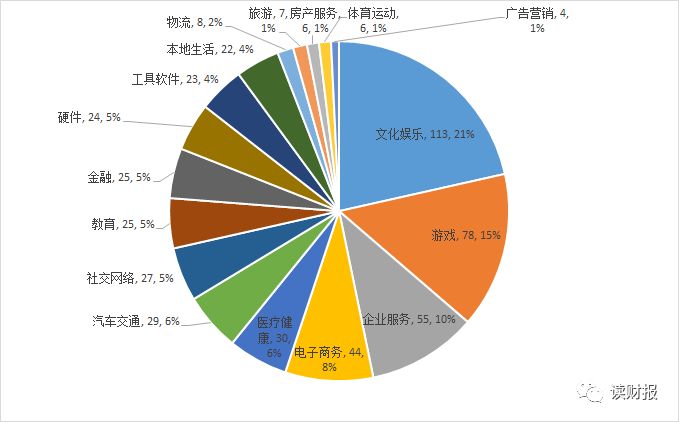 花了点时间把腾讯所有投资企业数据爬了下来,剔除多轮投资后共统计到526家企业拿到腾讯投资,其中文娱113家,占21%;游戏78家,占15%,随后是企业服务、电商领域。