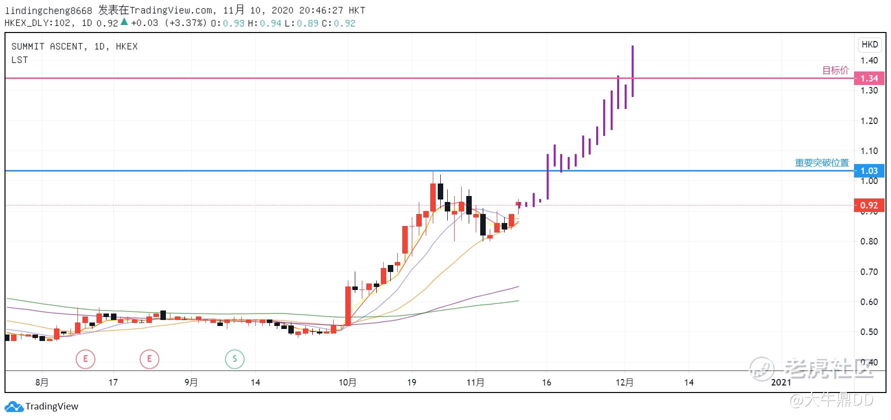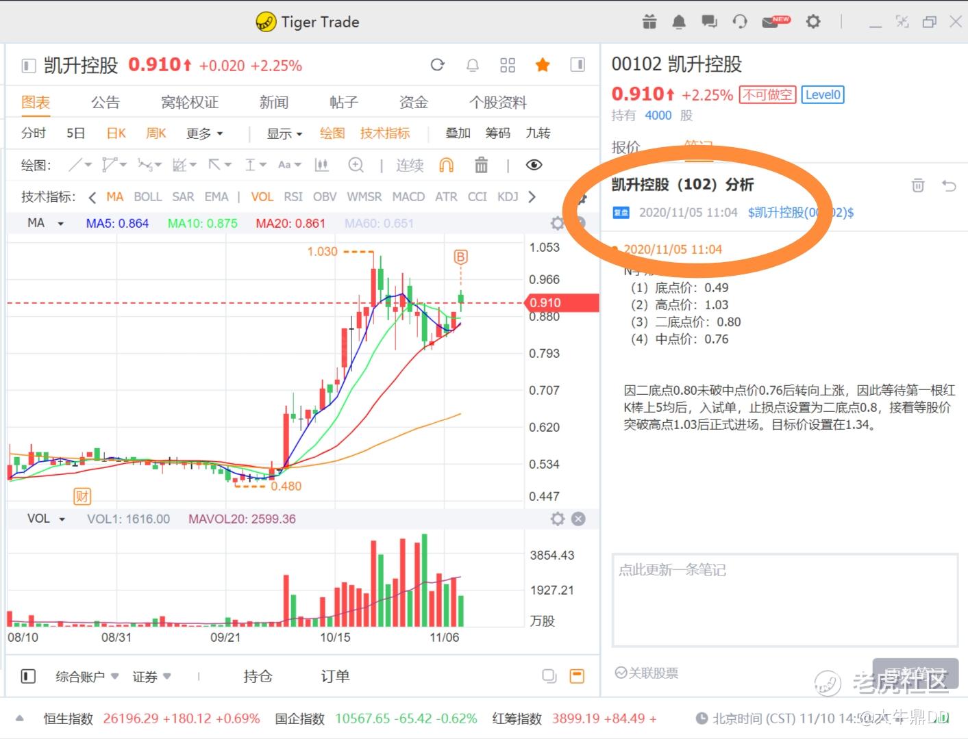 $凯升控股(00102)$跟我11月9日发表的$雷蛇(01337)$交易笔记一样,都是2020月11月5日记录下的股票,操作计划笔记:底点:0.49,二底:0.80,高点:1.03,目标价:1.34,试单区间:0.76-1.03,止损位:0.76,正式入场位:1.03以上。(如图1所示)。