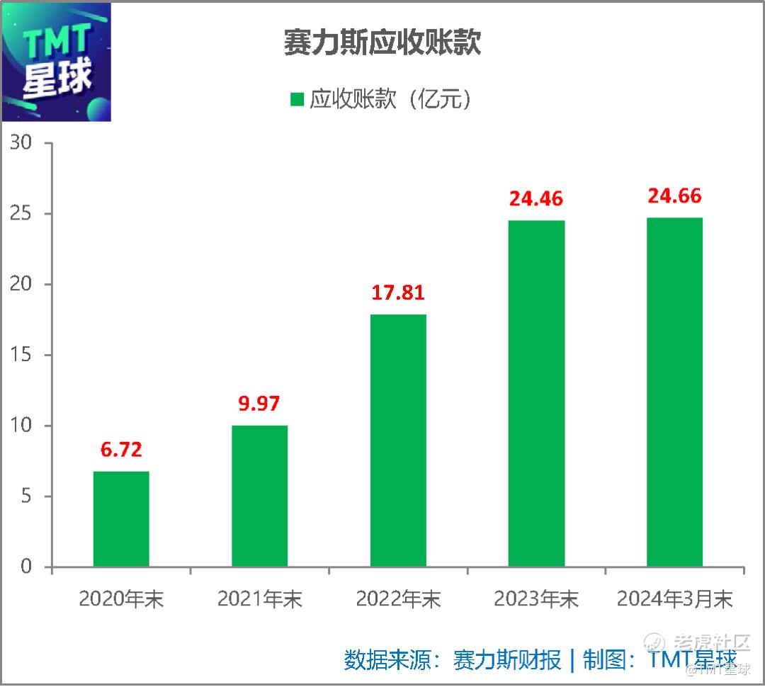 除了盈利难持续以外,赛力斯也面临应收账款增加的风险。根据财报,2020年末赛力斯的应收账款仅为6.72亿元,到了2024年3月末,这一数值已飙升至24.66亿元。