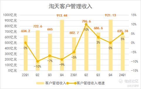 阿里内外的弓弦尚未完全拉满,已能看到商家端的变化。一个风向标是,代表淘天商家经营活跃情况的“客户管理”收入增速,经过两个季度回落后,再度拐头向上。截至一季度,淘天客户管理收入为636亿元,同比增长5%。