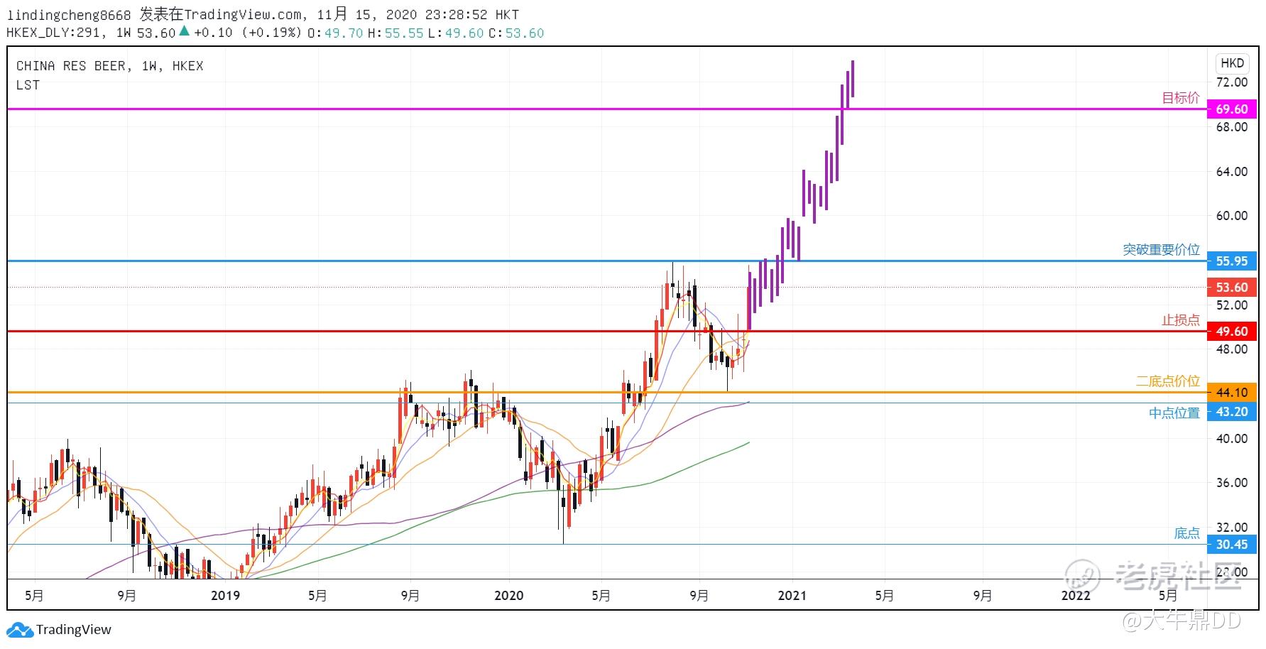 最后,$华润啤酒(00291)$目标价,而目标价的设定是通过高点55.95和底点30.45之差,再加上二底点44.10,所的出来的价位是69.60(如图1所示)。