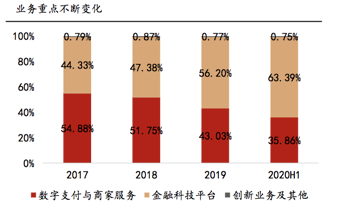 从16年至今,金融支付业务贡献的营收占比已经从55%下降为35.8%,而FinT业务从44%上升至63%,从侧面印证了这一猜想。