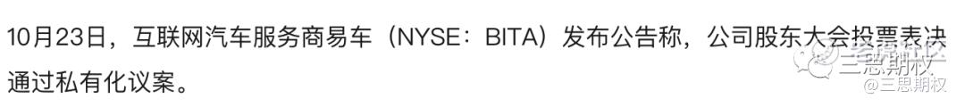 这支股票标的为BITA,Bitauto,易车网$易车(BITA)$ 。原来2019年9月就收到了私有化收购要约,消息传出后股票跳涨12%至15美元,但直到2020年6月,易车才正式和腾讯$腾讯控股(00700)$ 及Hammer Capital组成的买方团签署了具有法律约束力的合并协议,买方以每股16美元的价格购买易车股票,总交易金额达11亿美元。