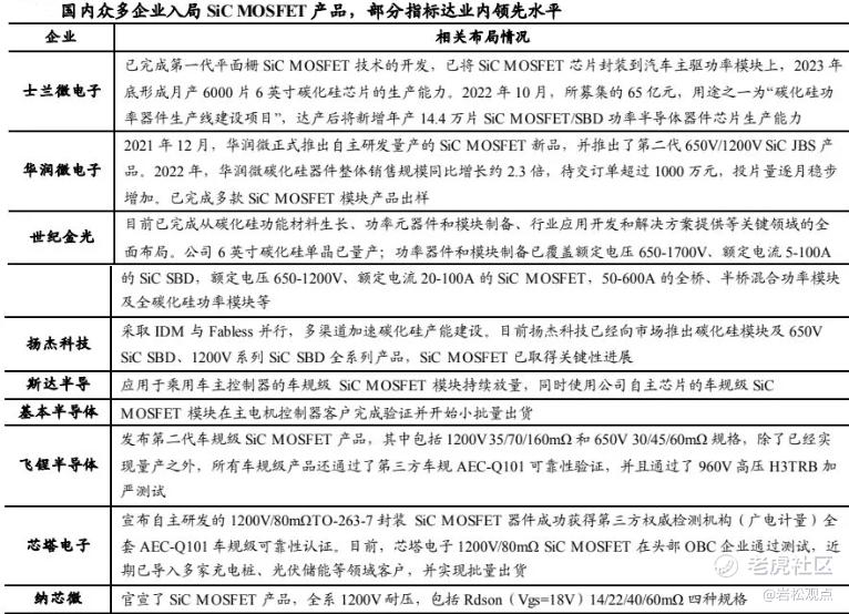 2023 年国内众多企业开始入局车规级 SiC MOSFET 产品,代表企业包括:士兰微、华润微、扬杰科技、斯达半导、纳芯微等。