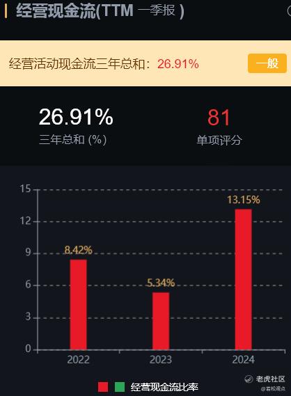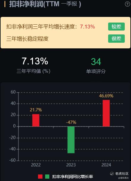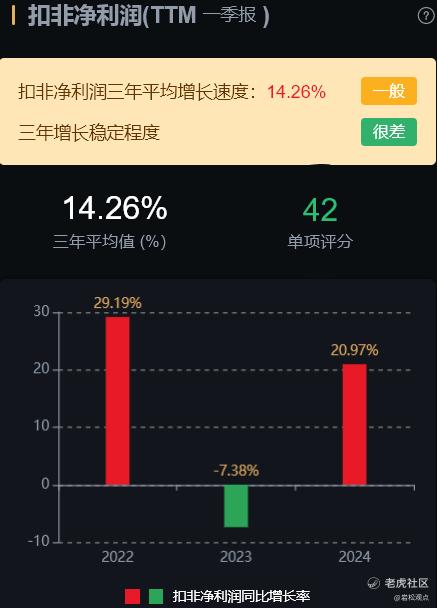 从经营层面看,营业收入三年平均增长速度:14.5%,扣非净利润三年平均增长速度:7.13%,成长性还行。