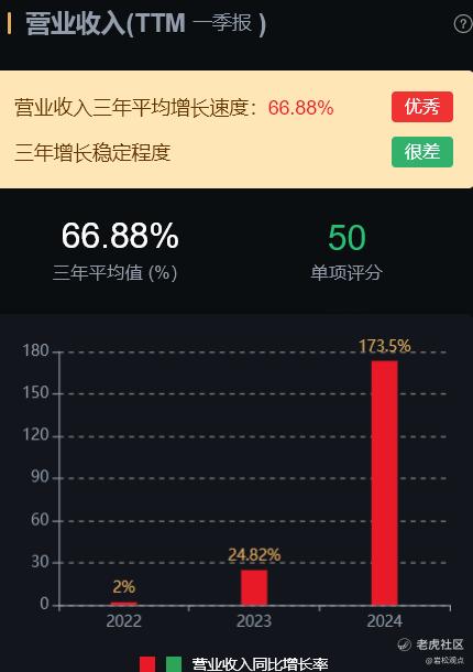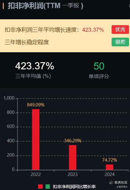 从经营层面看,营业收入三年平均增长速度:115%,扣非净利润三年平均增长速度:423%,成长性良好。