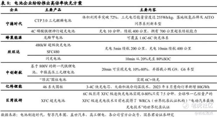 目前快充电池以三元体系为主,头部厂商可量产 6C 三元动力电池。宁德时代 2023 年陆续发布 CTP3.0三元麒麟电池、4C 磷酸铁锂神行超充电池,均支持 4C 超快充;蜂巢能源、欣旺达、中创新航等电池厂商陆续发布高倍率电池方案,4C 电池成为 800V 车型主流电池。