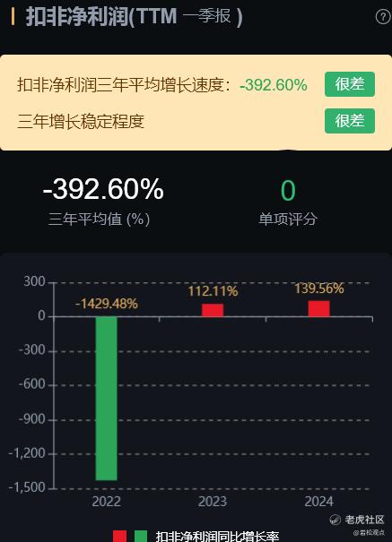 从经营层面看,营业收入三年平均增长速度:5.51%,扣非净利润三年平均增长速度:-390%。主要是2021年大幅亏损拖累。