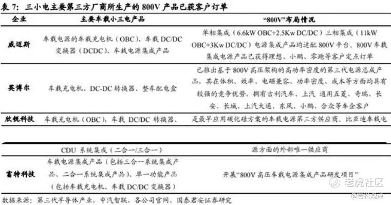 根据 NE研究院统计的 2022 年国内市场 OBC 装机量来看,市占率前五位分别是弗迪动力(28.66%)、威迈斯(20.44%)、特斯拉(8.61%)、英博尔(8.56%)和富特科技(8.47%)。其中,威迈斯的 800V 车载继承电源产品已获得理想、小鹏、零跑等客户的定点订单;欣锐科技已成为比亚迪、小鹏、极氪供应商。