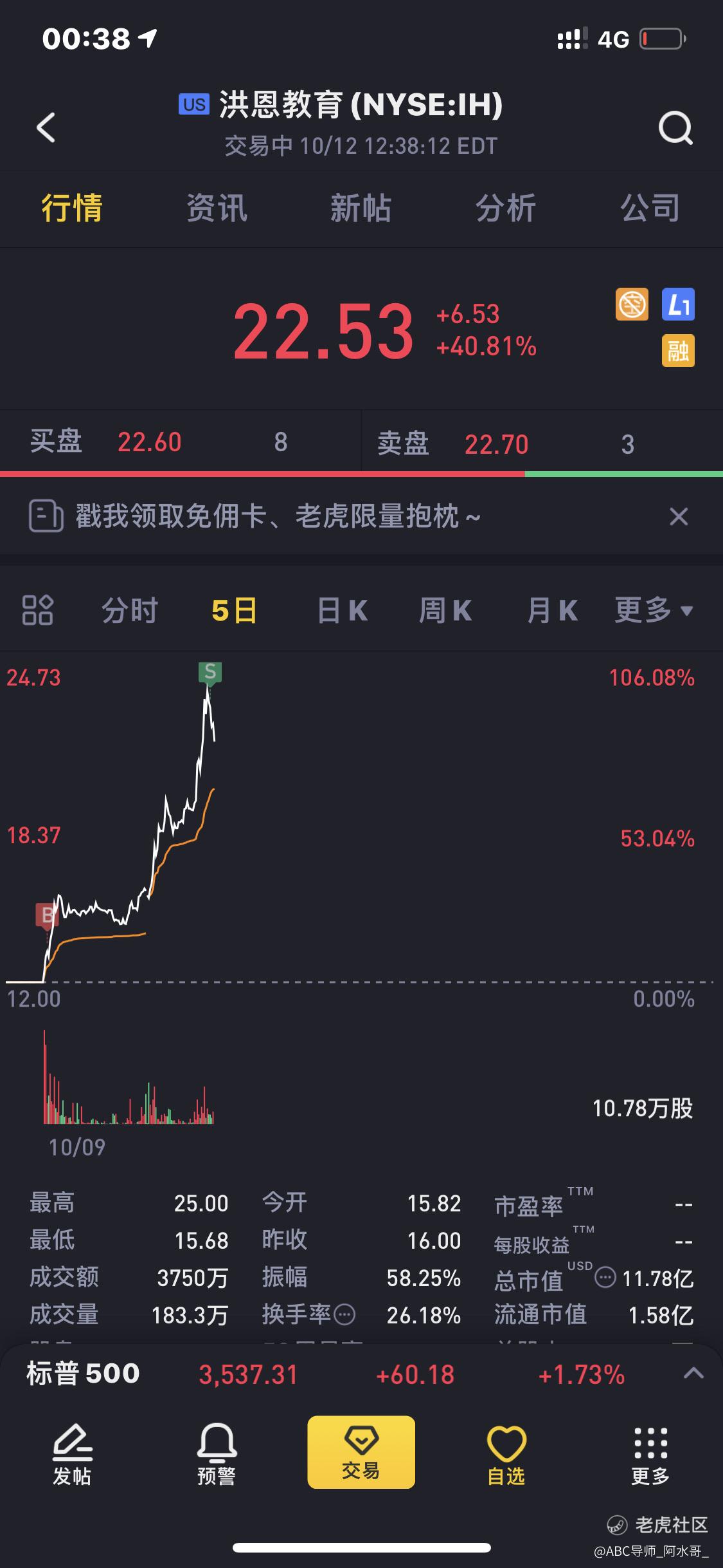 $洪恩教育(IH)$两个交易日涨80%,利润1.5万美元,限价单买入3000股,成交1290股,惨痛代价,少攒3万多美元!今年最惨痛教训,以后都要用市价单!再用限价单我扒灰[流泪][流泪][流泪][流泪]