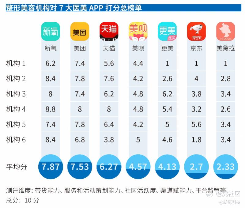 对于美容机构而言,渠道为王。哪家APP更能引流,拥有更多的赋能,渠道用户更加具有粘性、活跃度,成为美容机构对各大渠道进行考核的最重要环节。南都健康联盟课题组邀请了广州、佛山地区的六家主要整形美容机构,对新氧、更美、美呗、美黛拉、天猫、美团、京东七个医美平台APP进行测评,从五个主要维度,对这些医美平台APP进行逐一打分。作为上述平台的主要服务对象,他们对平台的优劣有着最为直观的印象和评价,也最为了解互联网平台应该如何契合当前医美行业的发展需要去进行改进。