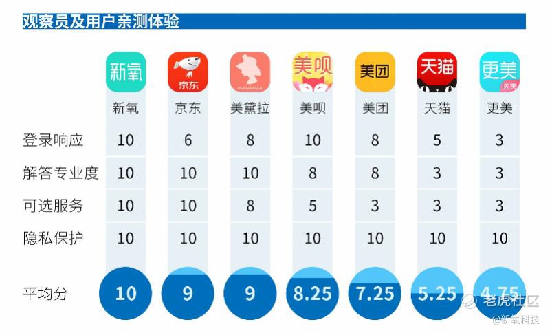 为此,南都健康联盟课题组也邀请了多位医疗美容领域的小白担任观察测评员,从用户的角度去对新氧、天猫、美团、京东、美黛拉、更美、美呗七款医美平台APP进行实际测评,按照亲测、交叉测评比较等多种形式,就平台服务的专业度、安全性、价格因素等进行打分,形成了榜单。