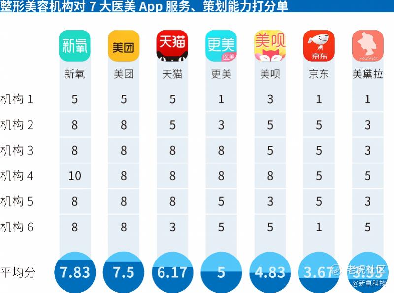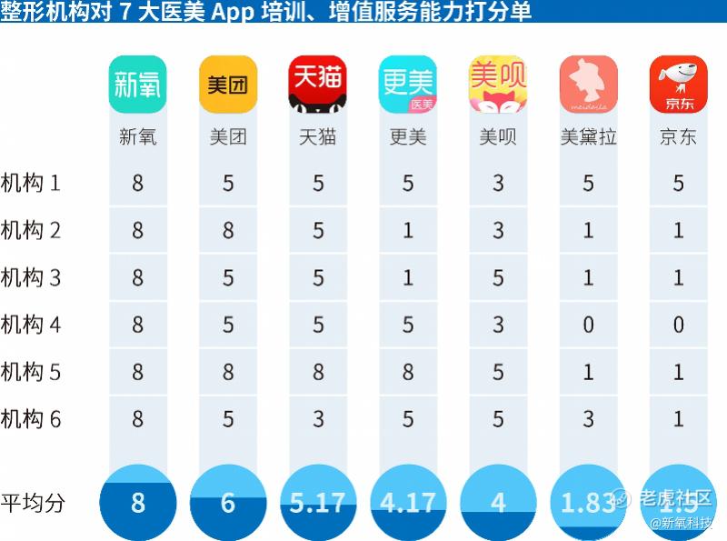 说明:对于渠道的社区活跃度和用户粘性,医疗美容机构作为最后的服务承接方,有着天然感受力,在为各大APP渠道进行打分的时候,医美机构是能够从引流数量、引流客户的质量,回头率、加单率等多个指标体系来评判一个渠道的优劣程度的。在这一项考核中新氧、美团、天猫优势非常突出。而其他四家美呗、京东、更美、美黛拉则因量少、粘性略差等因素,暂居第二梯队。