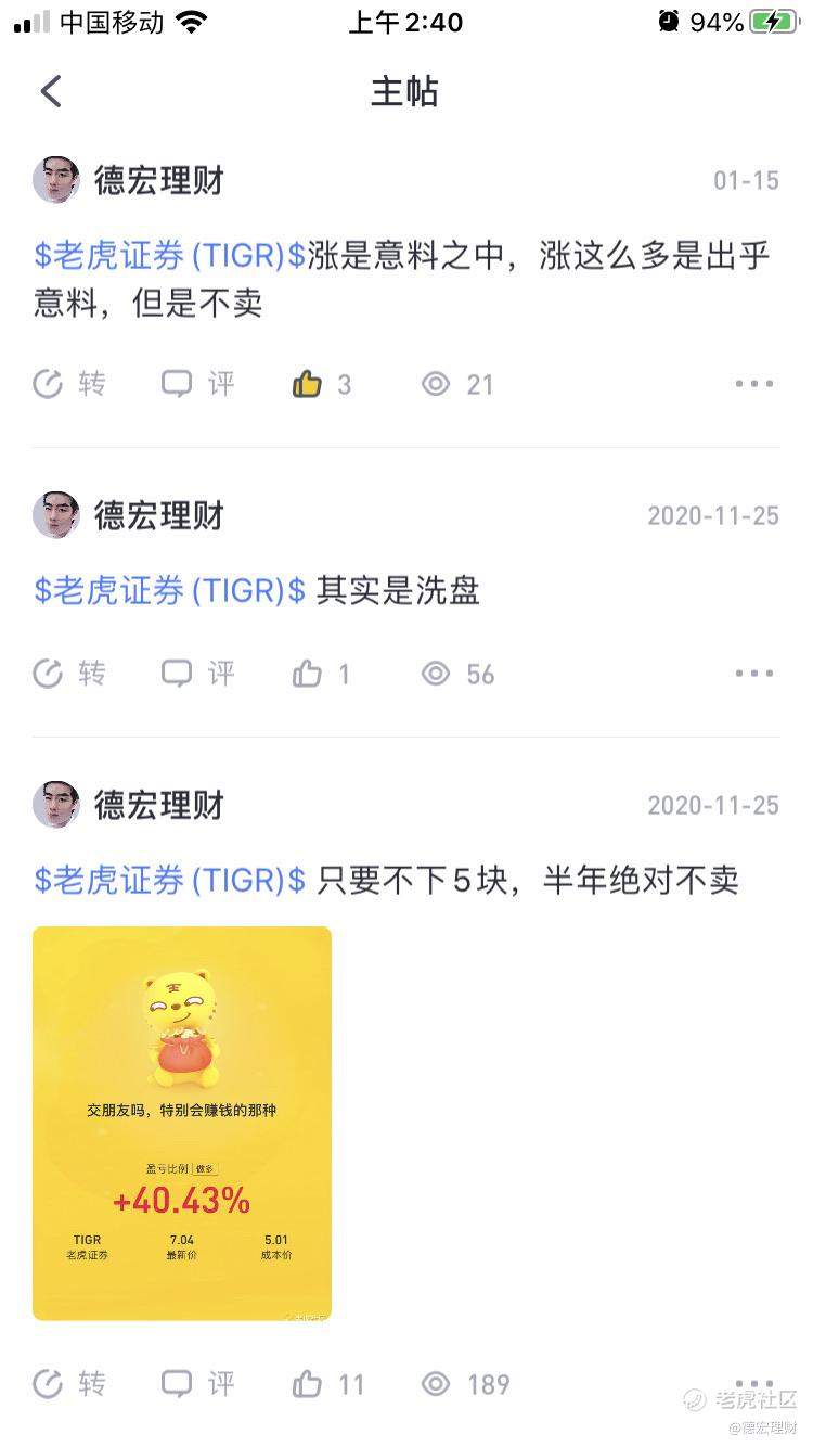 上40之后我卖了,从11月份一直看好老虎~看到市值120亿