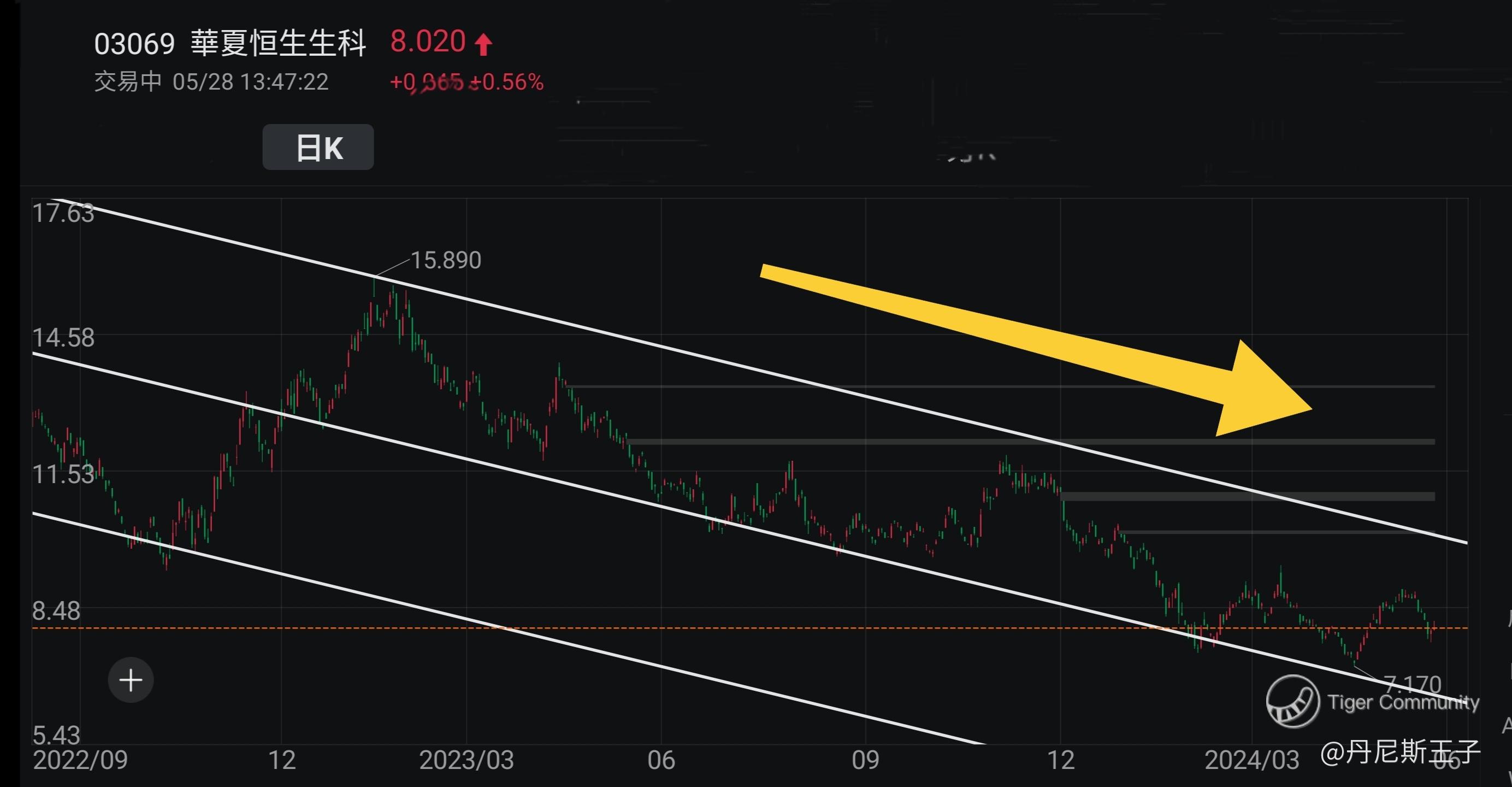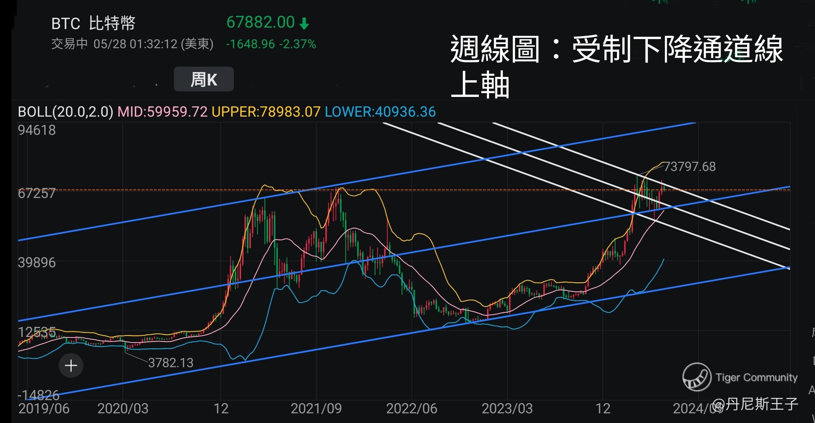 由于 比特币 和 以太坊已进入股票市场,因此王子认为纯用技术分析及通道线较实用。