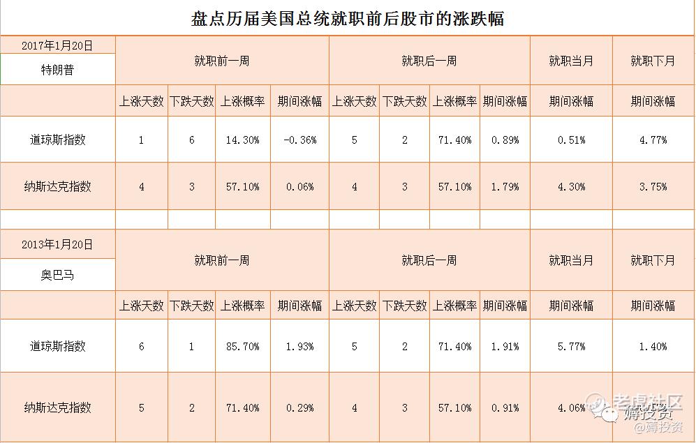 薅投资在拜登就职典礼前统计了相关数据,认为就职前后一周的涨跌幅都不大,而就职当月和下月上涨的概率较大。