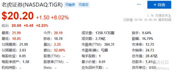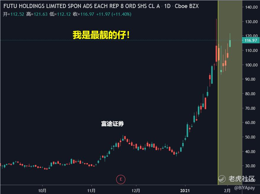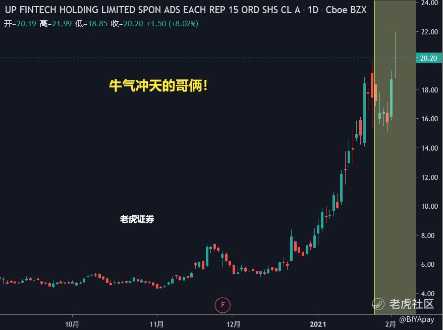 老虎证券和富途证券,这两家互联网券商最近可以说是牛气冲天。短短一个月时间,都上涨了400%。这是2021市场上最靓的两个仔。但我也搞不明白为啥涨的这么猛。涨就涨吧。没上车的就看戏吧,现在硬上有点危险。每天10%-30%的涨幅确实很诱人,但是现在有点恐高。
