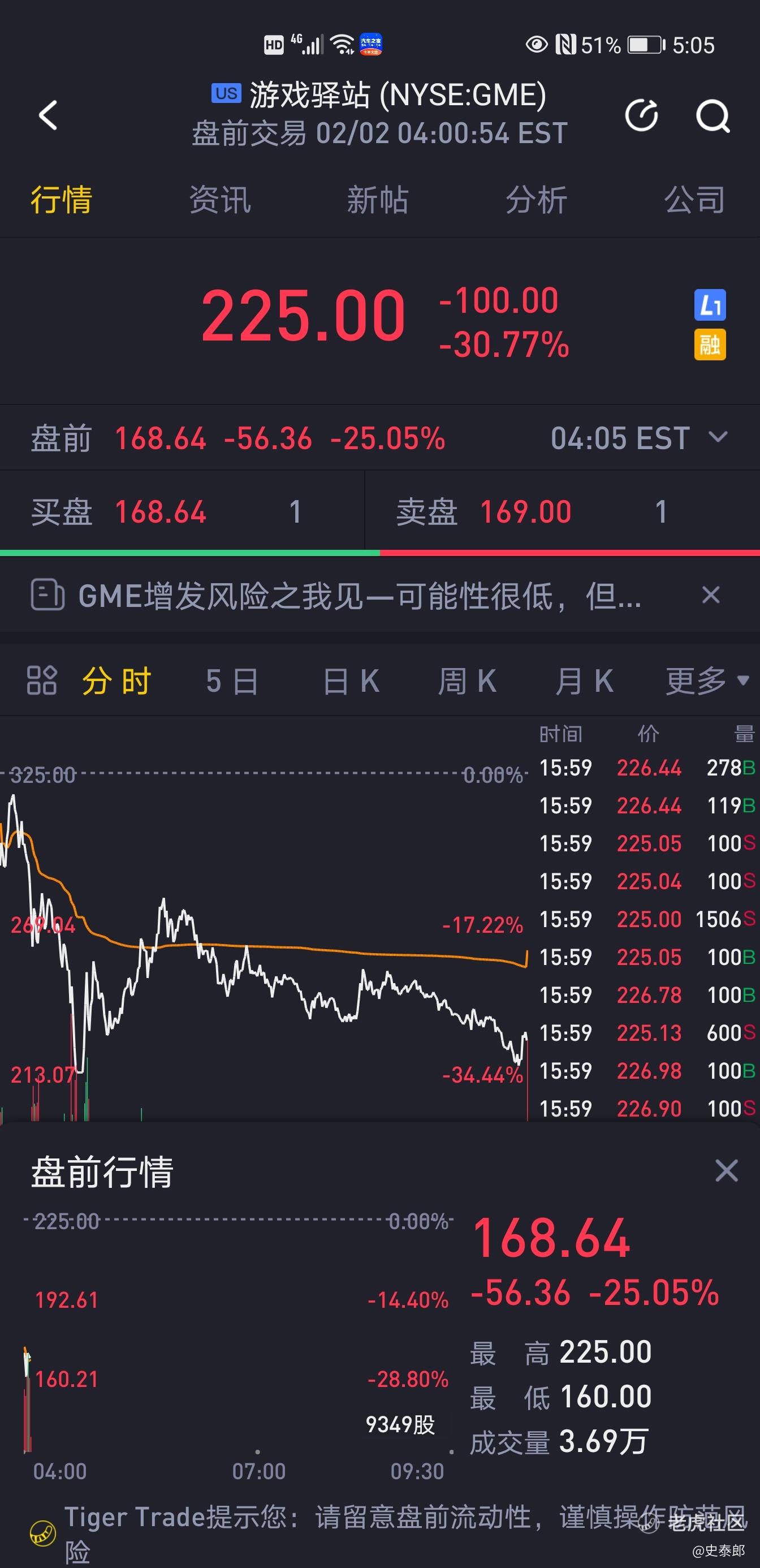 $游戏驿站(GME)$我每天强调一次吧,拿不住的人请把筹码让给拿的住的兄弟。这个票交易量和换手率低了以后,任何的情绪波动体现在股价上都是很剧烈的,就像现在,盘前成交量才小几万股,就把股价往下砸了25个点,这不是机构在砸,是散户自己在砸。所以,我再强调一遍,不懂的麻烦看戏就好,不要进来捣乱!