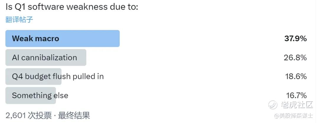 在一项针对Q1软件表现疲弱原因的投票结果现实,其中投票的选项包括宏观经济疲软(Weak macro)、AI对传统软件的侵蚀(AI cannibalization)、Q4预算提前花费(Q4 budget flush pulled in)以及其他原因(Something else)。投票结果如下:
