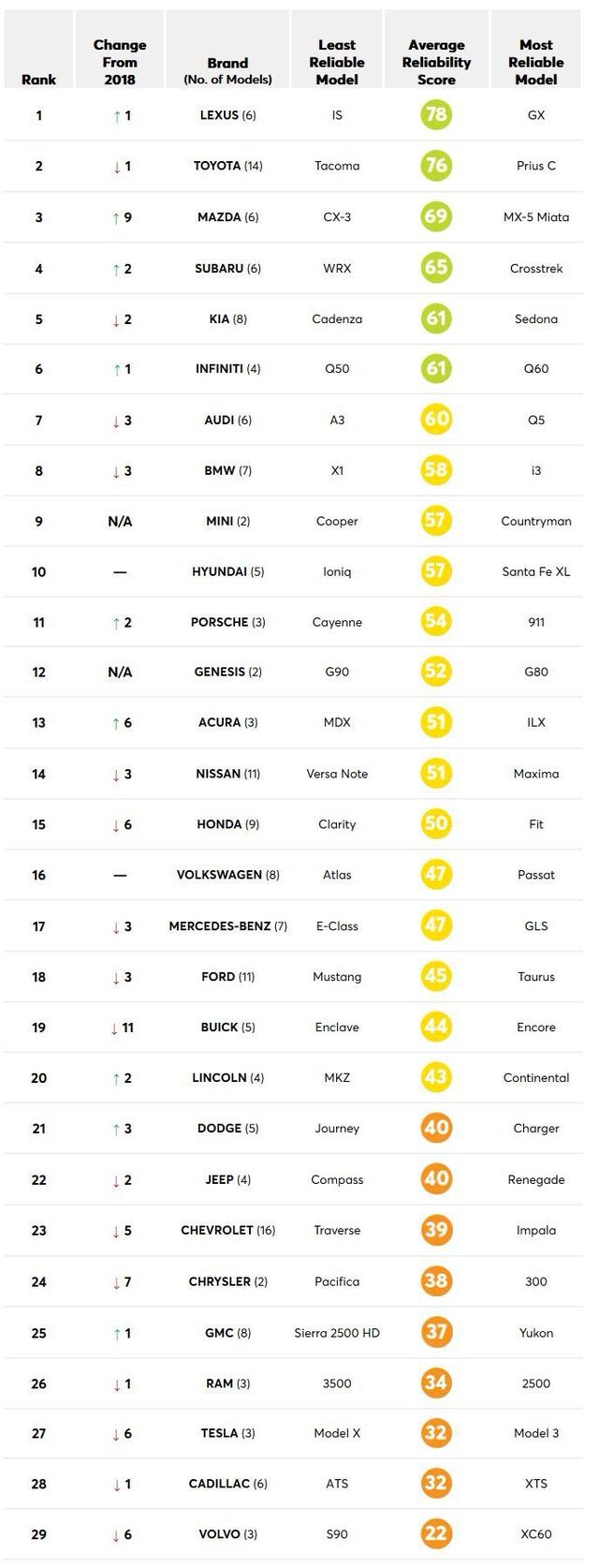 在今年的《消费者报告》中,美国本土汽车品牌全部位于新车可靠性排名的后半部分。该报告共收集了超过50万辆车的数据,涵盖了美国市场29个品牌。
