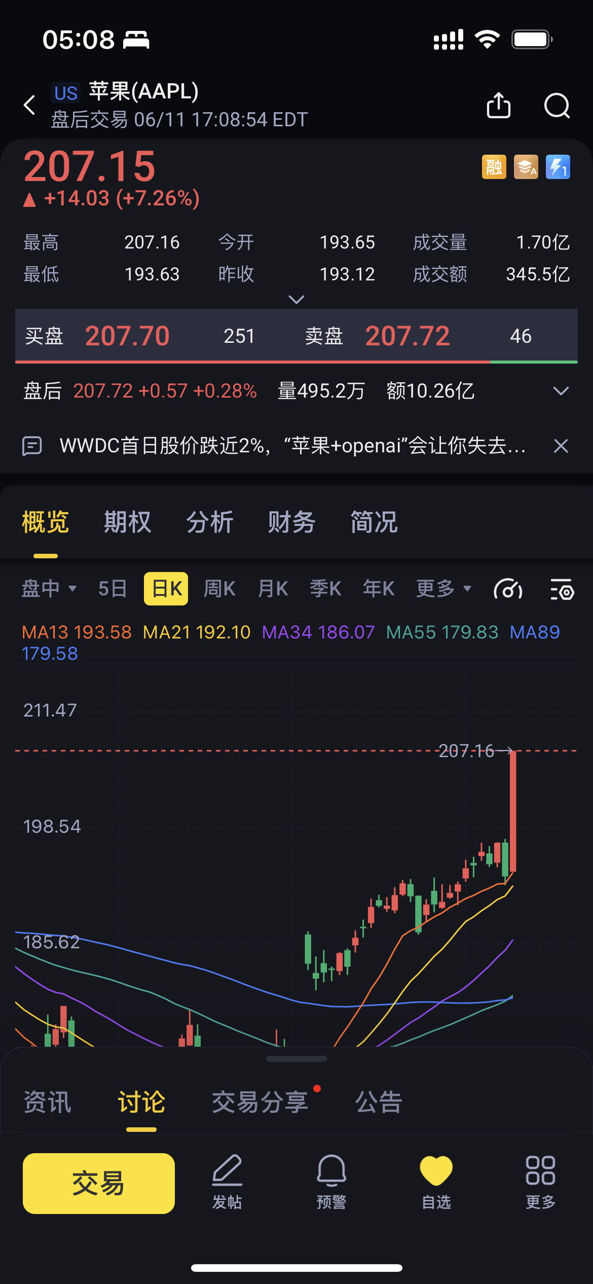 $AAPL 20250117 200.0 CALL$ 苹果区间震荡了一两年,昨晚突破了,即使不考虑其它单是这种突破信号就值得买入开仓,所以昨晚睡前我直接市价long call了苹果(5月初它180时我挂单long call没买进去)。