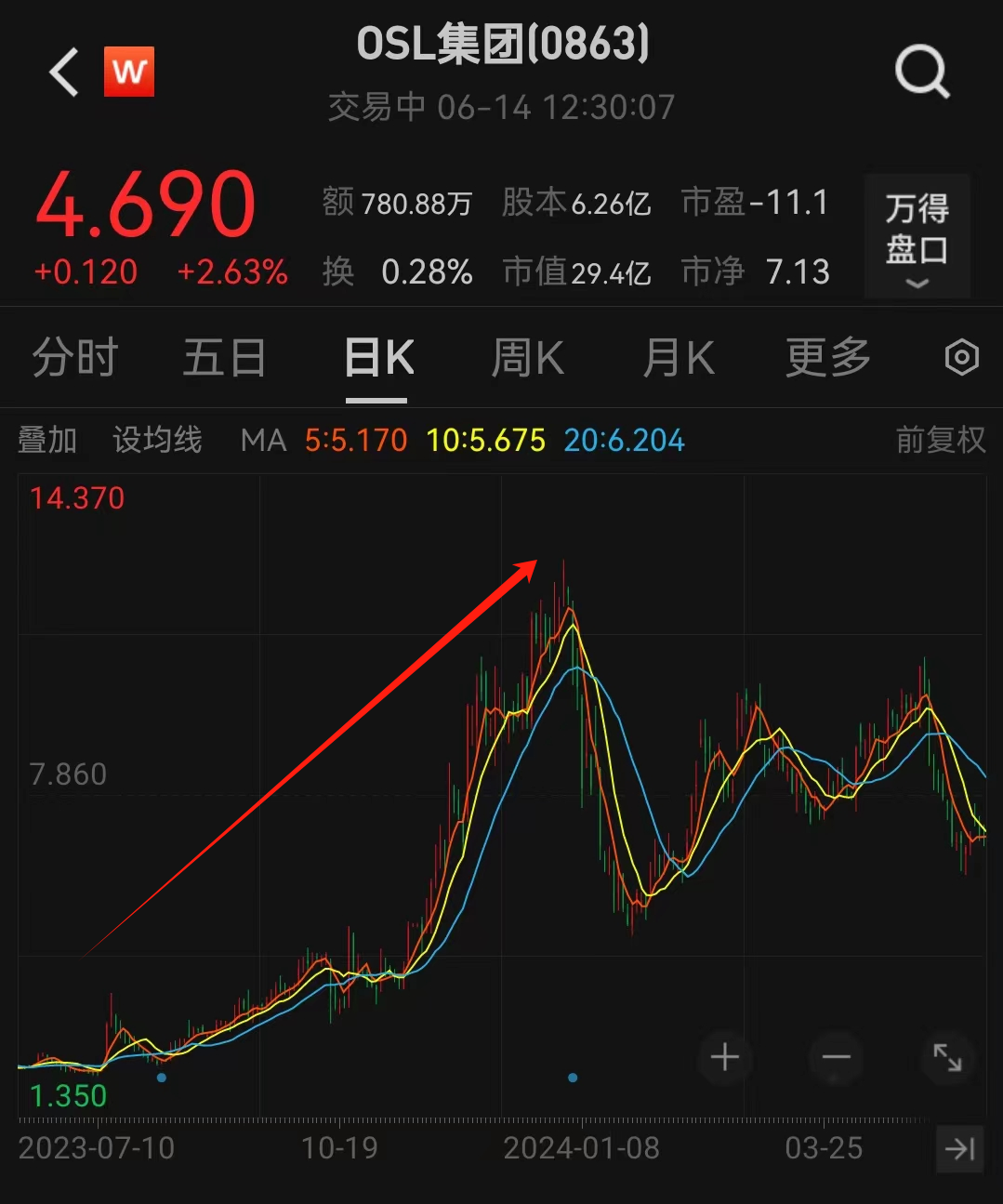 受益于虚拟资产交易平台的牌照获批,OSL集团在2023年年内,股价一度暴涨近8倍。