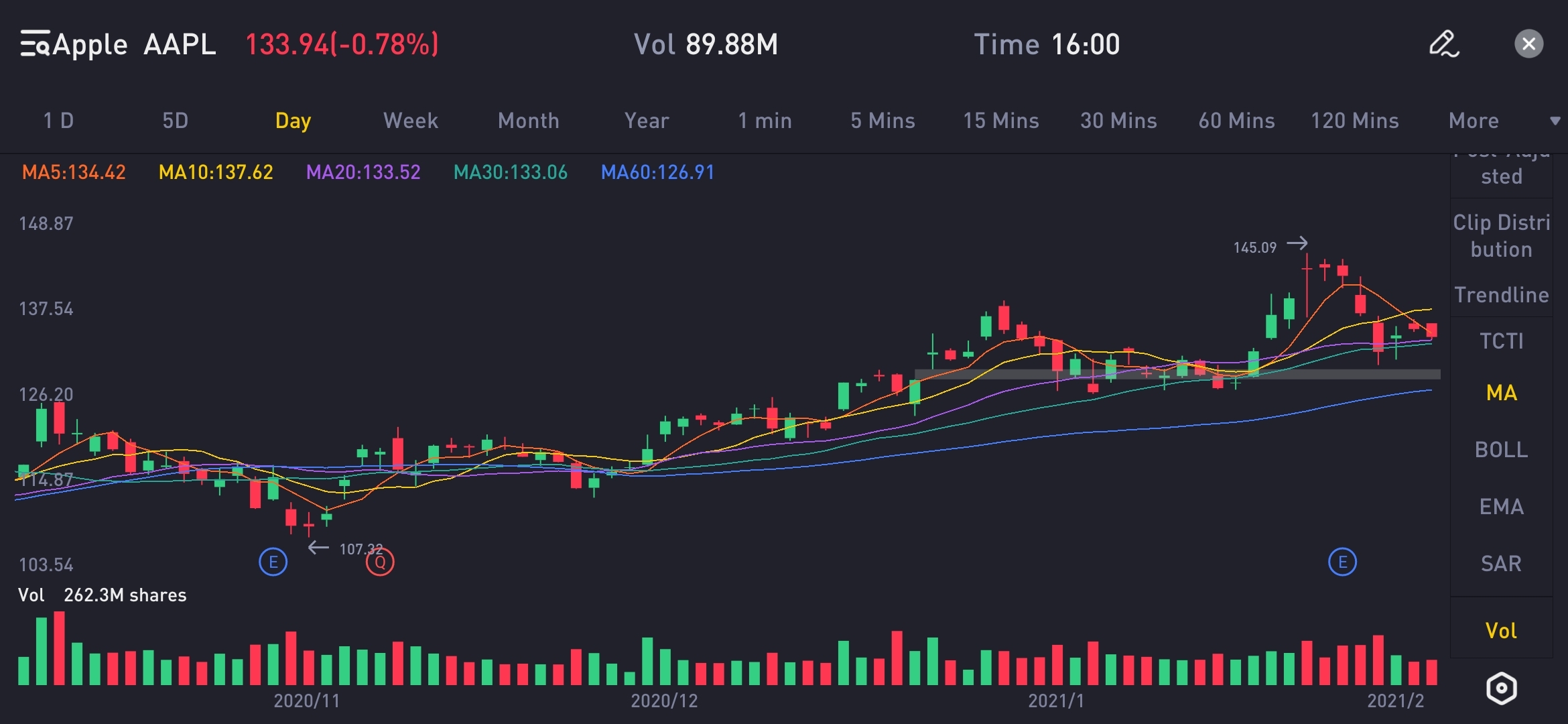 而股價回落的時間點發生在1月26-1月29日,恰逢大盤回調,蘋果股價隨之下跌直到最低點131。
