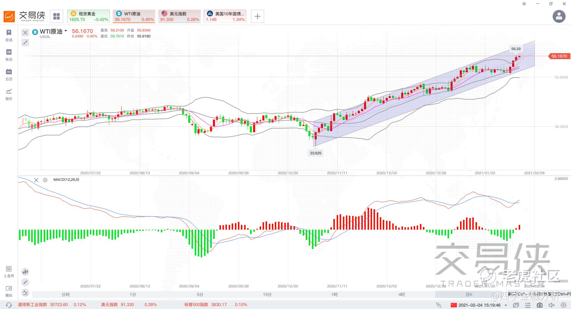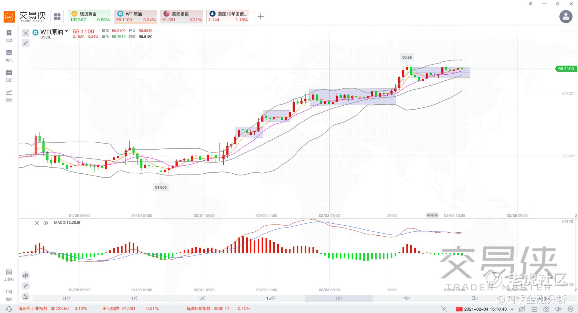1小时级别,大家有没有发现,原油每次刷新高点后就会中场休息,横盘一阵子,然后继续发力,现在原油正处于蓄力阶段,就等着一鸣惊人,K线依然是跟着均线走的,短期支撑看向今日凌晨回调低点55.5处,布林带三轨上扬,呈多头排列趋势,均线形成金叉,MACD快慢线在0轴上方运行,但还没有交汇,绿色能量柱的存在表明了油价还有回调的空间,因此今日仍然保持回调做多的策略。