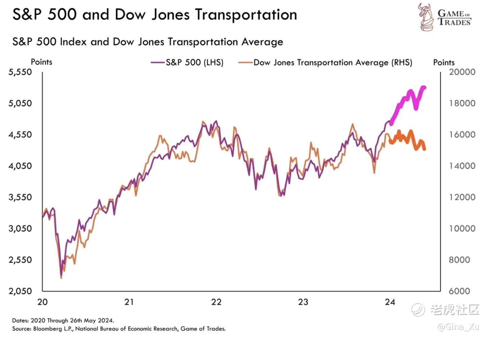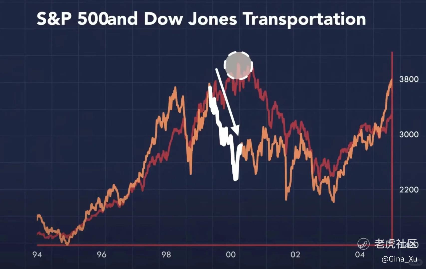 1.一个美股指数先行指标叫:道琼斯交通运输指数,特指20主要交通运输行业企业股价综合值,在1973、2000年两次股市暴跌前一年左右领先下滑。也比较好理解,消费领先资本市场下滑。图三这个指标已开始劈叉;