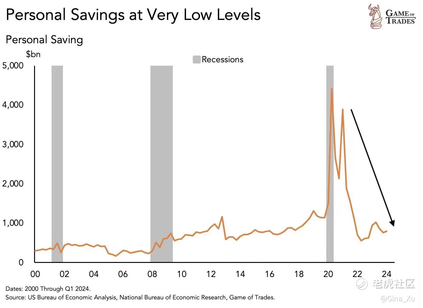 图四,美国老百姓存款已降至二十年低值,没钱了;
