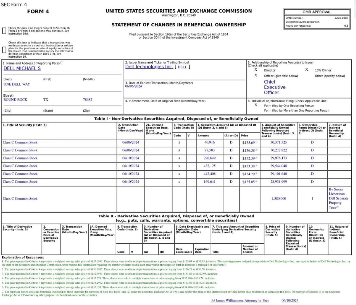 【戴尔科技CEO再抛自家股票,价值1.98亿美元】美国证券交易委员会(SEC)于美东时间6月10日披露的一份文件显示,戴尔科技创始人兼首席执行官迈克尔·戴尔(Michael S. Dell)在2024年6月6日至6月10日期间,通过六笔交易出售了自己所持的约148.02万股戴尔科技(DELL.O)的C类普通股票,总价值超过1.98亿美元。需要注意到,今年3月6日以来,迈克尔·戴尔开始不断抛售自家公司的股票。截至6月11日,迈克尔·戴尔已累计售出超过1354.9万股自家股票,价值约15.72亿美元。受到人工智能市场乐观情绪的影响,不少美股科技巨头的股价上浮,戴尔科技的股价在一年之内的涨幅达到了175.54%。截至美东时间10日美股收盘,戴尔科技股价为132.45美元/股,当日涨幅为1.91%。