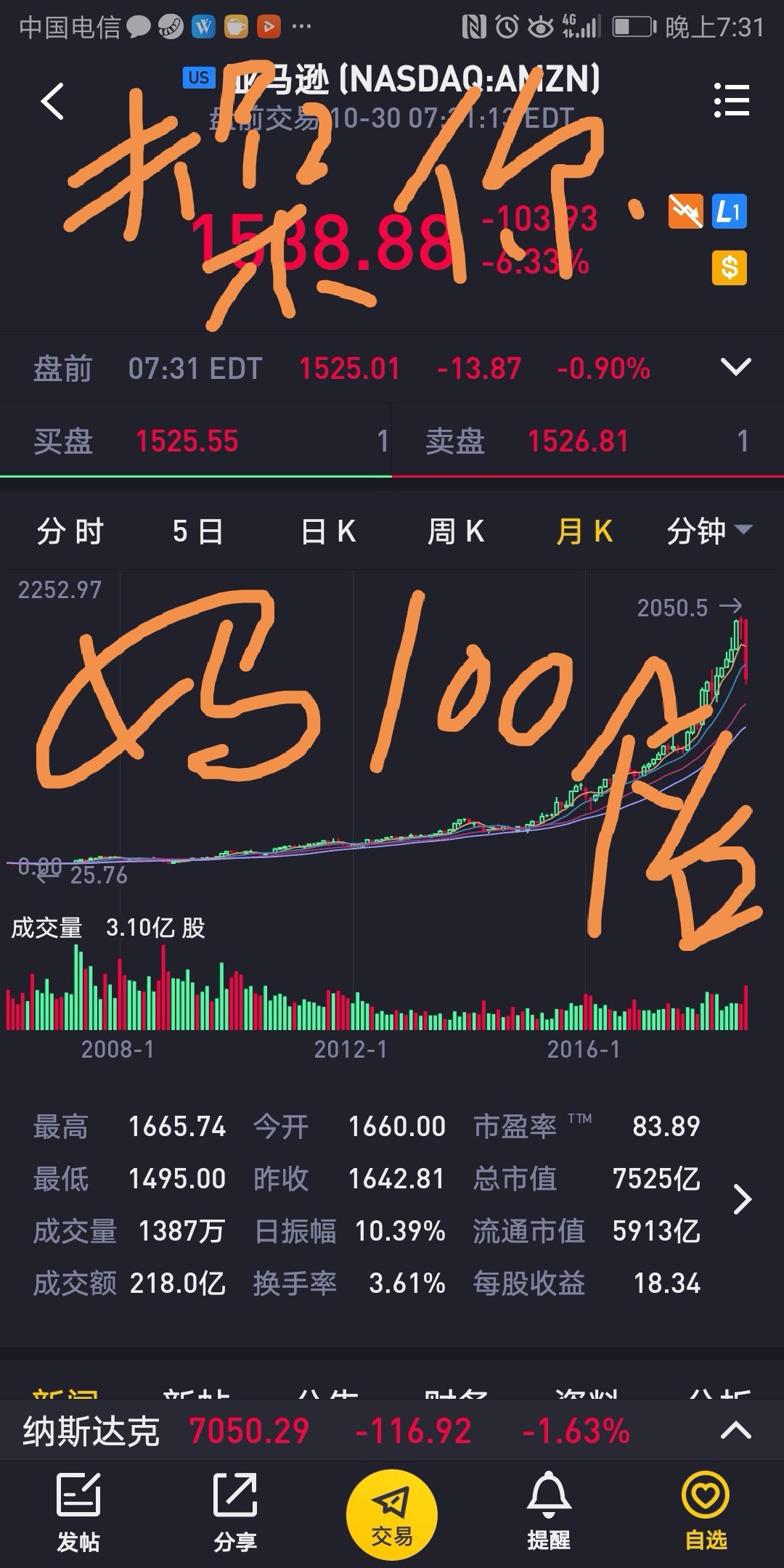 $亚马逊(AMZN)$亚马逊,明显已经到天花板了,一年100亿美元的净利润,相当于75倍得市盈率了,而且购物网站终归是一种消费,目前已经过度电商化了,完全透支了未来的空间,电商已经进去下半场,未来一定是低增长,负增长,跟社交媒体一样,一定是占用时长的东西,一样会在不知不觉中触到天花板,没有未来了。