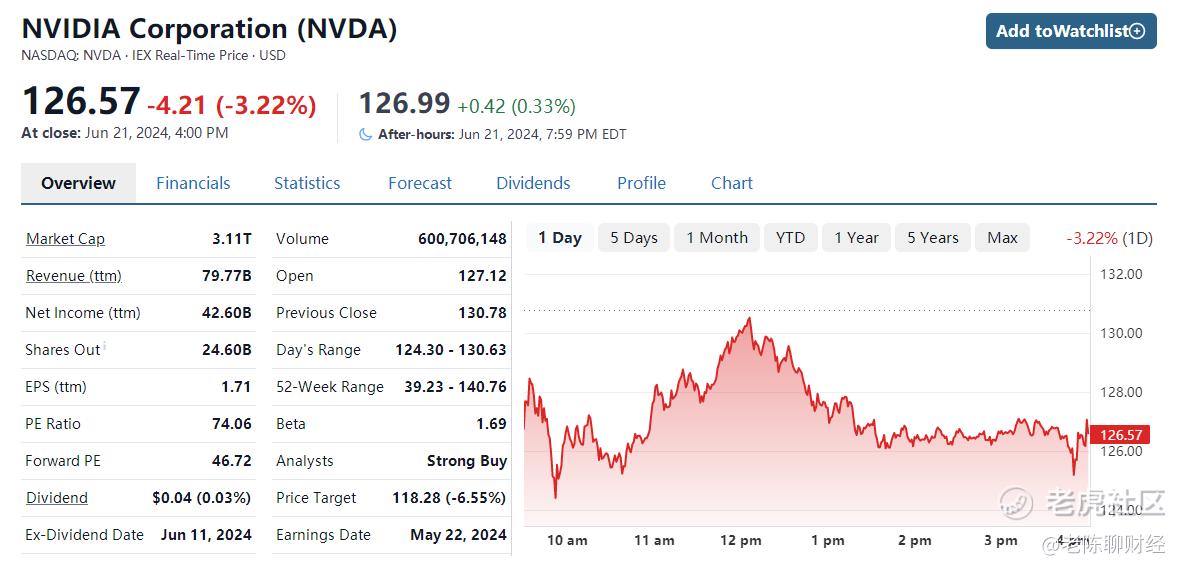 截止周五收盘英伟达股价下跌3.22%至126.57美金。虽然本周英伟达股价下跌超过4%,但是上个月上涨了33.3%,今年以来上涨了162.76%。