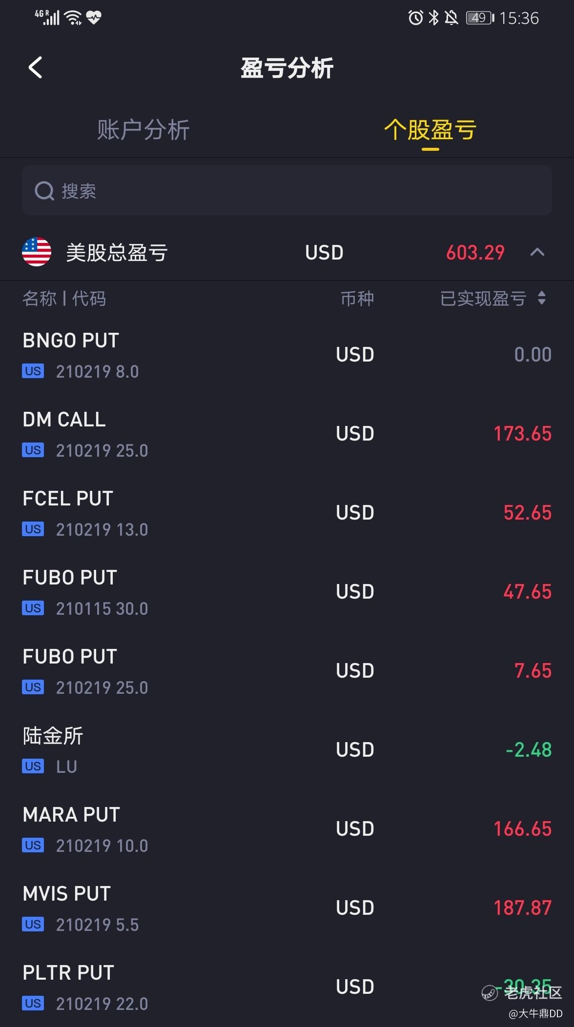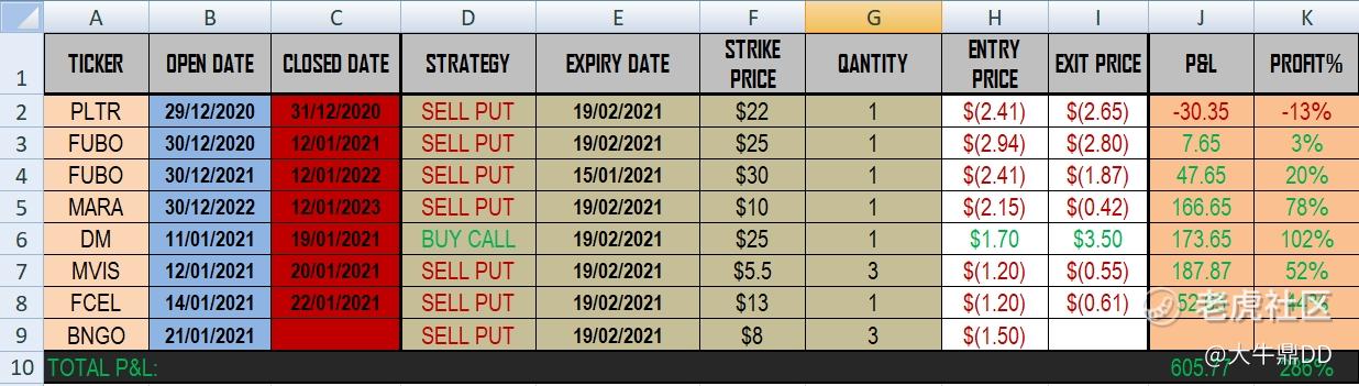 大家可以看一下我的期权交易盈亏情况图(如下图1所示),这个月我是一共交易了8笔,其中7笔已平仓,剩余一笔BNGO的期权还未平仓,总盈利为603刀。
