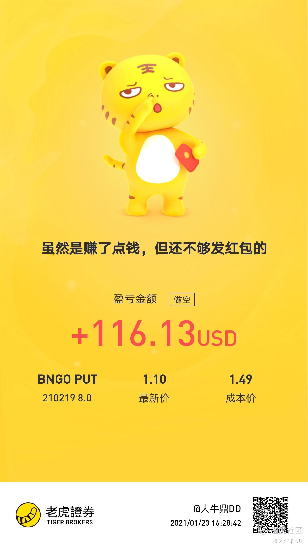 如果该票我拿到前天周五,我应该可获利145刀,收益率达到60%,因为前天周五PLTR股价大涨25%,虽然有点可惜,但这也是因为自身学习不够所造成的亏损,上交些“学费”让自己能更深度地学习到有用的实盘经验,也不为是一件好事。对于还有一笔未平仓的BNGO期权现今浮动收益也达到116刀,收益率为26%(如图3所示),这笔很大可能性我也将在下周获利离场。