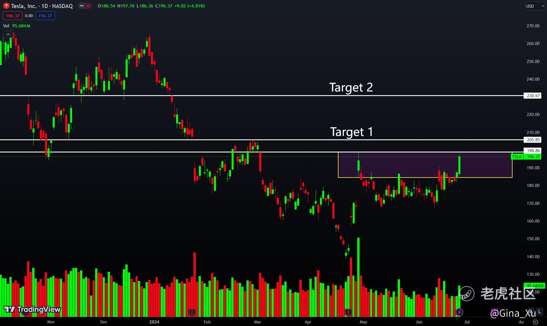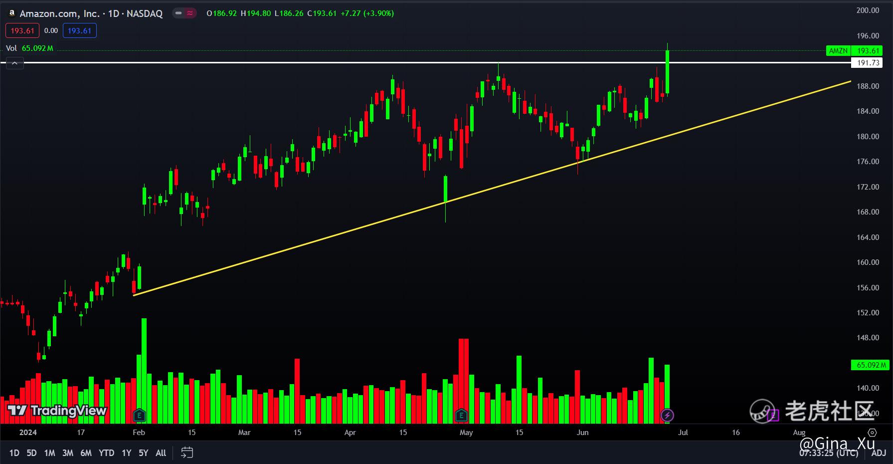 -基本面上亚马逊将推出类似Temu的低价折扣区,推动股价突破190强阻力,市值首次超过2万亿美元,技术面上中继三角形上沿突破,新一轮上涨行情开始,短期看涨至200。