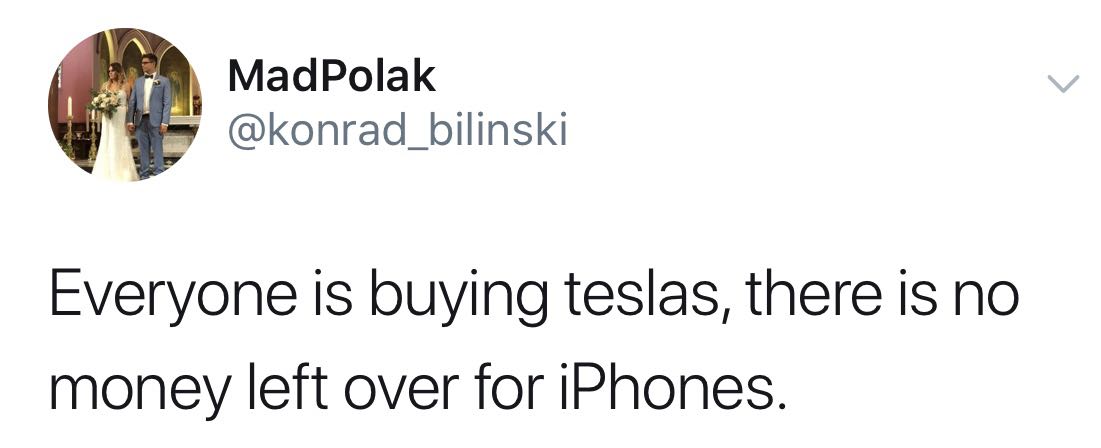 不知道,推特上看到的,tesla 给点赞。美国人已经把注意力投向特斯拉了,而不在是苹果