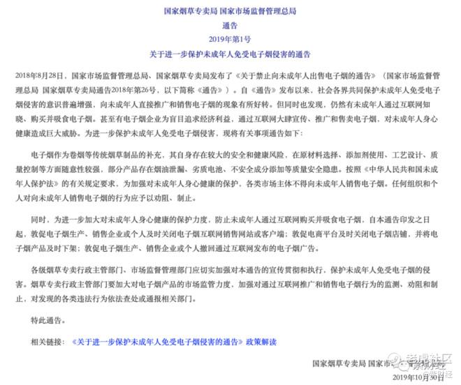 注意到种种问题后,2019年10月,国家烟草专卖局、国家市场监管总局发布《关于进一步保护未成年人免受电子烟侵害的通告》,一方面敦促电子烟生产、销售企业或个人及时关闭电子烟互联网销售网站或客户端,另一方面敦促电商平台及时关闭电子烟店铺,并将电子烟产品及时下架,并敦促电子烟生产、销售企业或个人撤回通过互联网发布的电子烟广告。