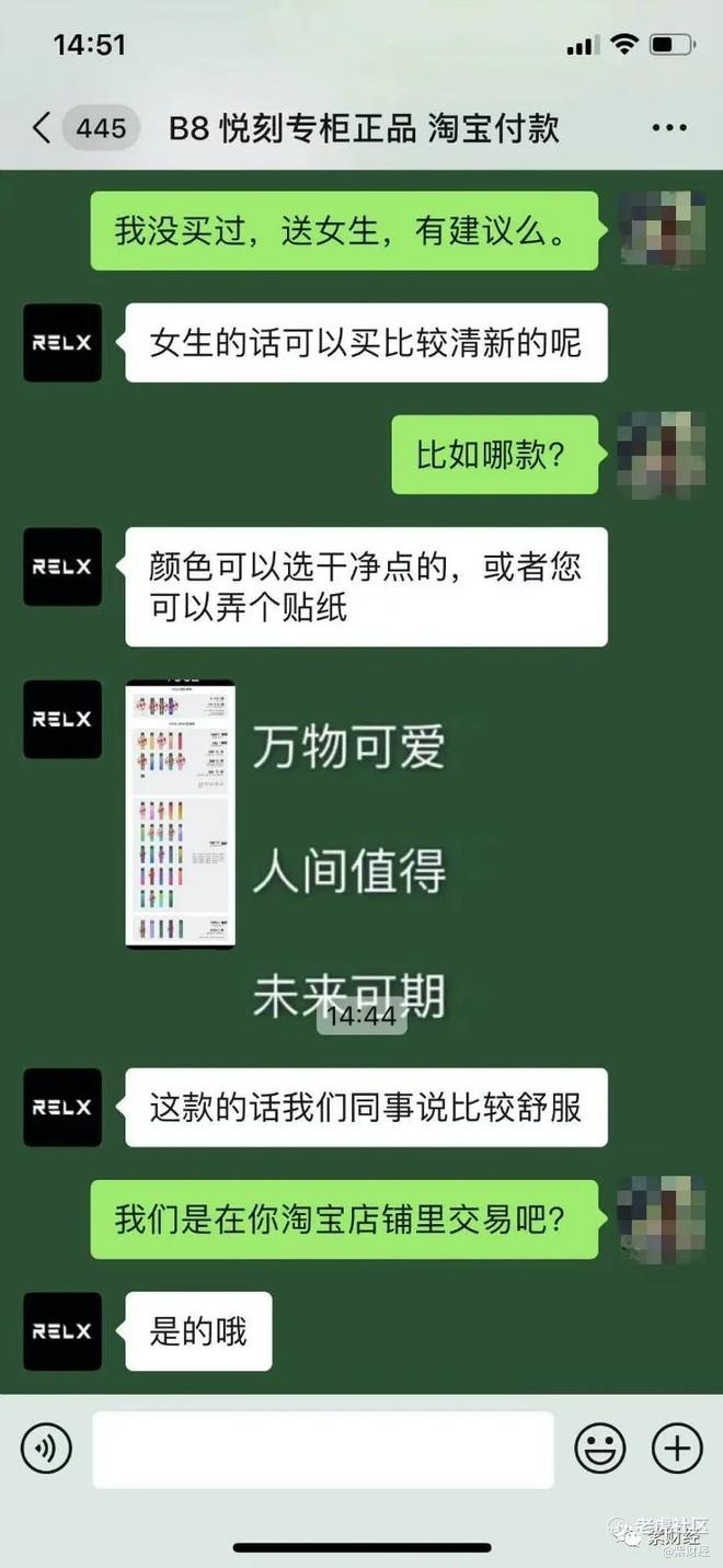 紫财经搜索悦刻充电盒时发现,淘宝店铺“甜心****”以915笔付款的好成绩排名前列,于是以买家的身份发起咨询,卖家二话没说,直接甩过来一个微信号。