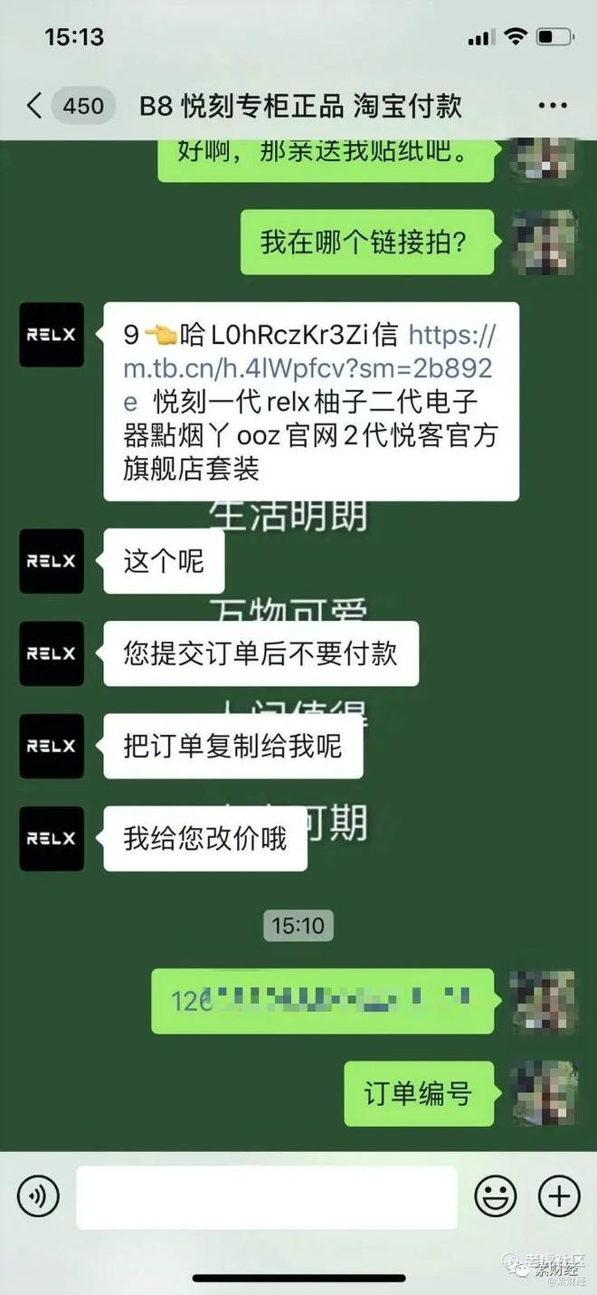 双方确定交易意向后,“B8悦刻专柜正品 淘宝付款”给出了淘宝付款链接,复制后打开手机淘宝APP即跳转到那款充电盒链接。卖家提醒紫财经提供订单号改成实际价格再作支付。