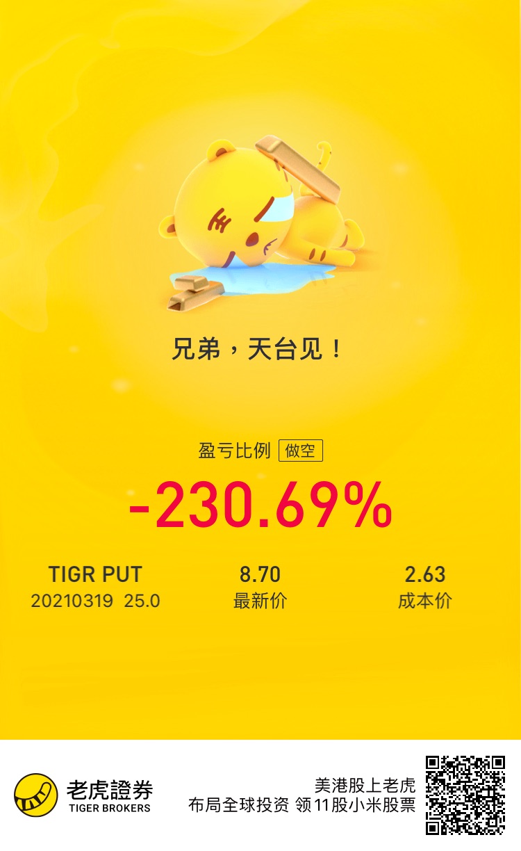 $老虎证券(TIGR)$这次算买个教训,在市场异常波动的时候,如果不是在合理价位以下,不要乱乱Sell 短期的 Put,不然得不偿失啊[捂脸] [捂脸] 今天再观察观察,再跌可能会暂时止损,之后再抄底了[冷漠]