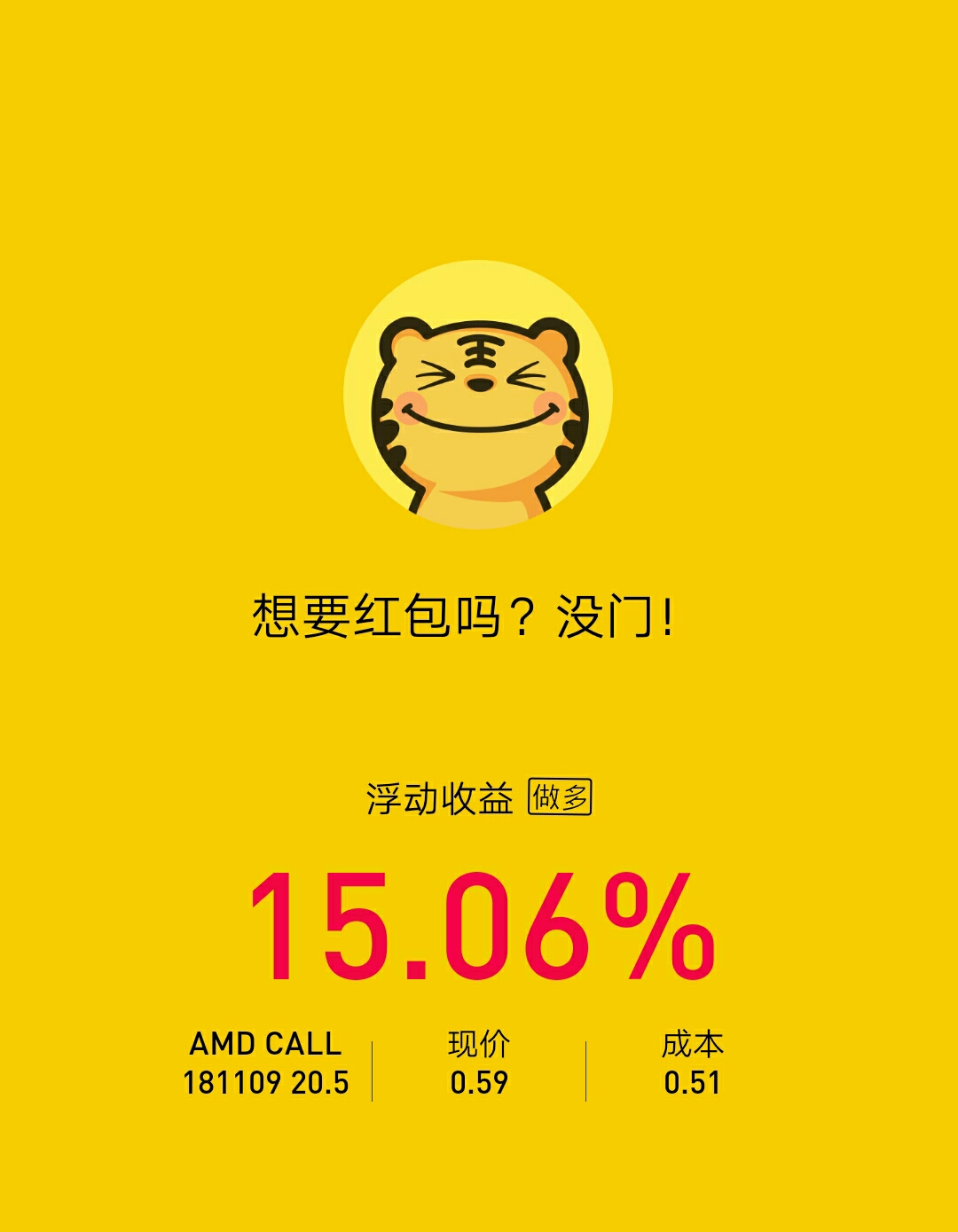哈哈,刚想回复你那个亏了44%的帖子,我1小时前跟媳妇说,amd我好想买,好想买,最后还是担心没买,这涨上去了,有点郁闷,结果刚才一看手机,我擦嘞?我竟然有几手call,才想起来3小时前买的给忘了,😄😄