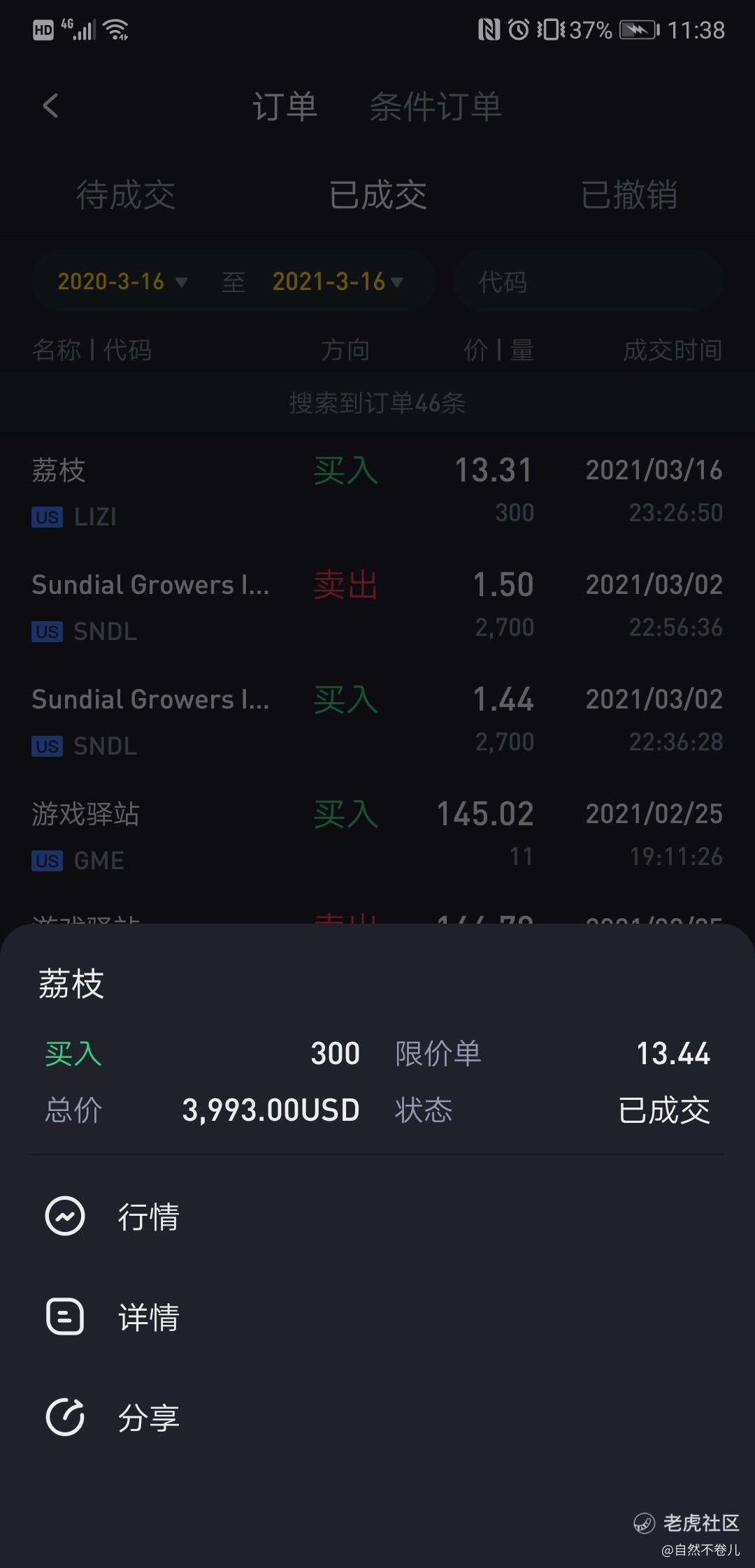 今天遭遇了一次意外,我非常及时的买入了荔枝,问题是老虎出问题了,我踏马现在也不知道买没买上,成交显示已成交,持股又没有,资金也没变化。真是气死我了,都大爷的一股赚一块多了,真是不顺,恶心啊!