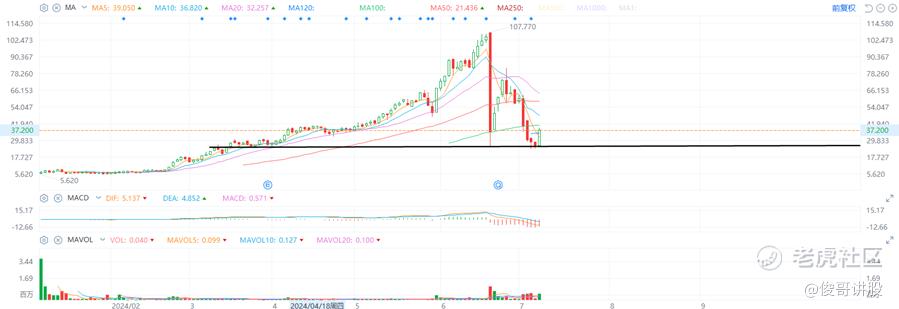 近期走势,长久股份的股价在达到107元的高点后,出现了较大的回调。股价在25元附近获得支撑,这是一个重要的心理价位和技术支撑位,今天股价回弹升至37.2元左右。刚好到了前期平台位置,后市看大概率会突破。基本确认25元左右是本轮调整的低位。