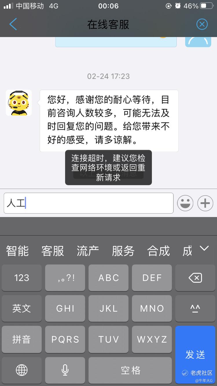$老虎证券(TIGR)$$富途控股(FUTU)$老虎的客服服务真的烂,WiFi,4G都说连不上,我看是你们的系统宕机了吧,舍不得在软件开发和运营上花钱,迟早把你的这几百万用户推向别家@小虎AV@老虎证券@巫天华