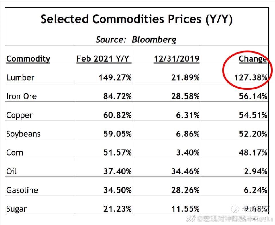 看到的數據,過去一年木材價格上漲150%,鐵礦石價格上漲85%,銅價上漲60%,大豆上漲60%,玉米上漲52%,原油上漲37%,汽油價格上漲34%,糖上漲21%,咖啡上漲20%... 居然有人說沒有通貨膨脹?🙃